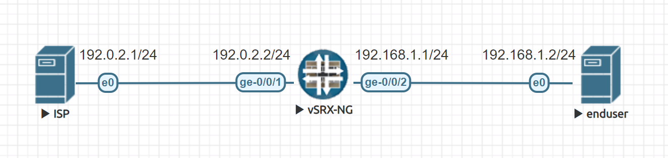 So, if we ping 192.168.1.2 from a device on the ISP side (e.g. 192.0.2.1), it should not go through the SRX. This is because if we send a packet destinated to 192.168.1.2 into SRX’s interface ge-0/0/1.0, and since ge-0/0/1.0 is associated to the routing table ISP.inet.0, there are no detailed route to 192.168.1.2, thus the packet is routed back to ge-0/0/1.0 thanks to the default route.