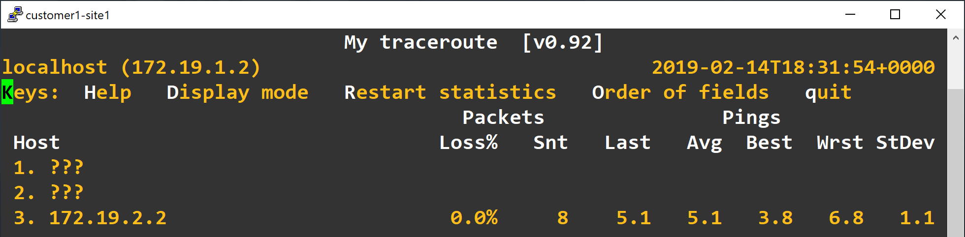 首先我们确认同一个客户的两个站点之间可以互相ping通。由于我们的配置启用了PHP和TTL propagation,同一个客户的两台设备中间经过三台MPLS路由器以后会出现两跳非IP路由,所以如果我们使用traceroute或者mtr来测试的话会看到以下输出: